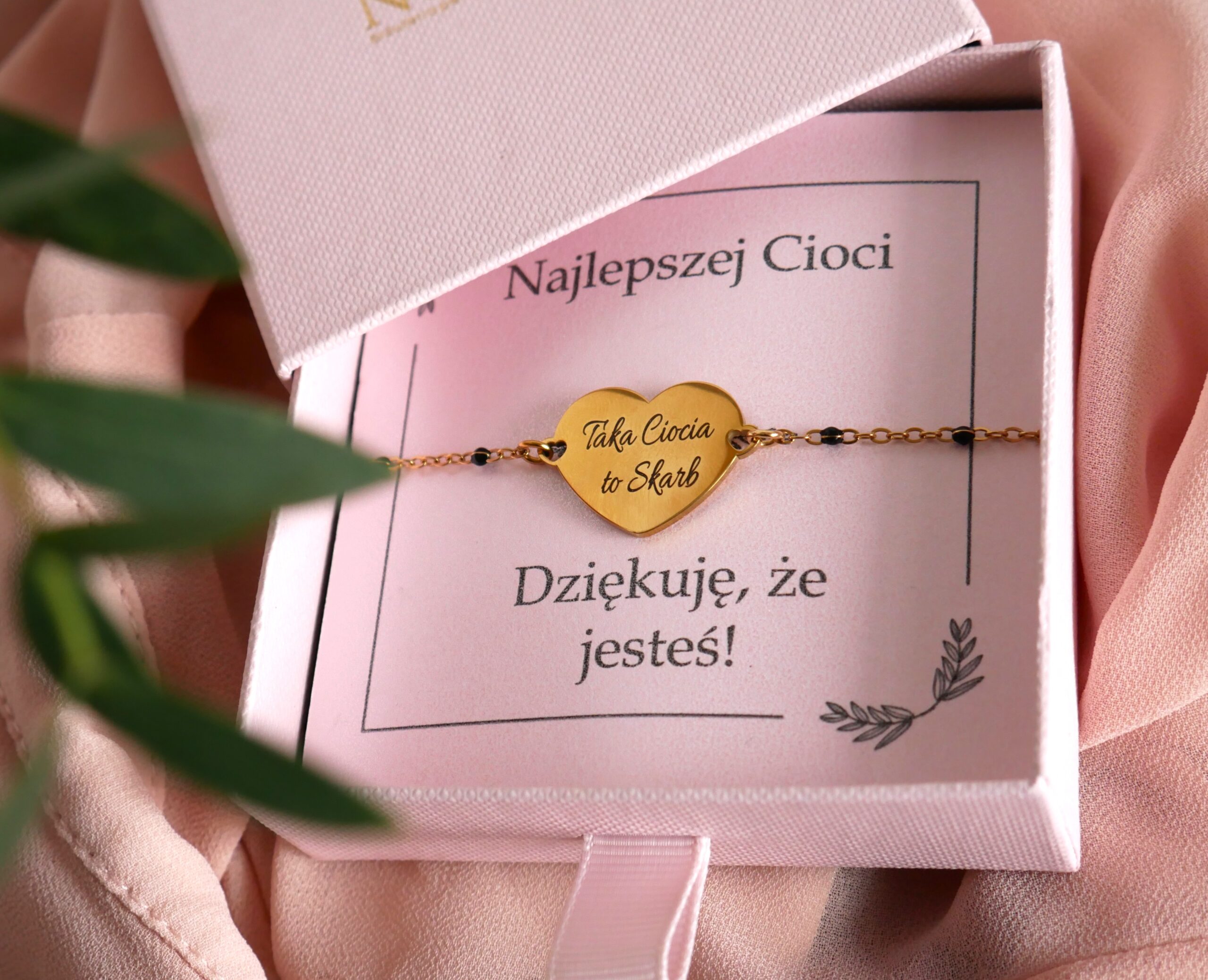 – Bransoletka zapakowana w rózowe pudełeczko z karteczką – Najlepszej Cioci